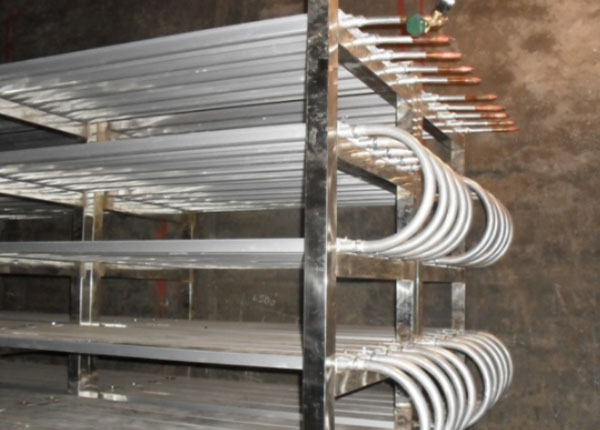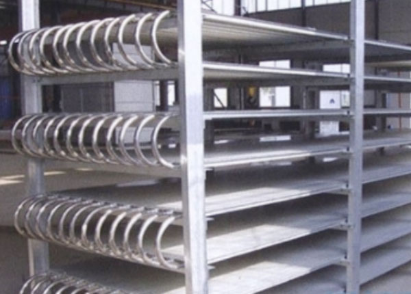 平板式铝合金速冻搁架,是取代钢制搁架排管的新一代节能产品。用于速冻肉类、禽类、水产等。速冻排管采用质铝合金一次挤压成型,管内有齿型。铝的导热系数为210W(m.℃),老式钢制速冻排管导热系数为46W(m.℃)。相比之下速冻排管具有优良的导热性能。速冻排管为平板式结构,大大增加了换热面积,缩短速冻时间,实例证明与传统钢排相比可以减少1/2面积,省电60%,并提高生产效率。平板式铝排管内外经过特殊处理,保证管内洁净,延长压缩机使用寿命。采用防腐能力强的铝合生产,使用寿命长,同时符合食品卫生标准。与¢38钢排相比,铝排管内容积小制冷剂的充注量会大大减少,节省制冷剂费用。产品可根据用户需求按冷库实际尺寸定制大大增加速冻库的利用率。
